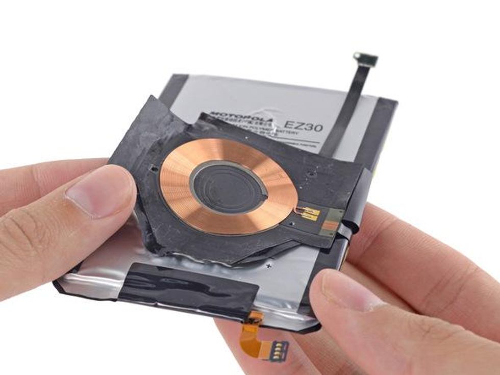 The shiny copper coil is an inductive charging station and peeling that off reveals the phone's battery.