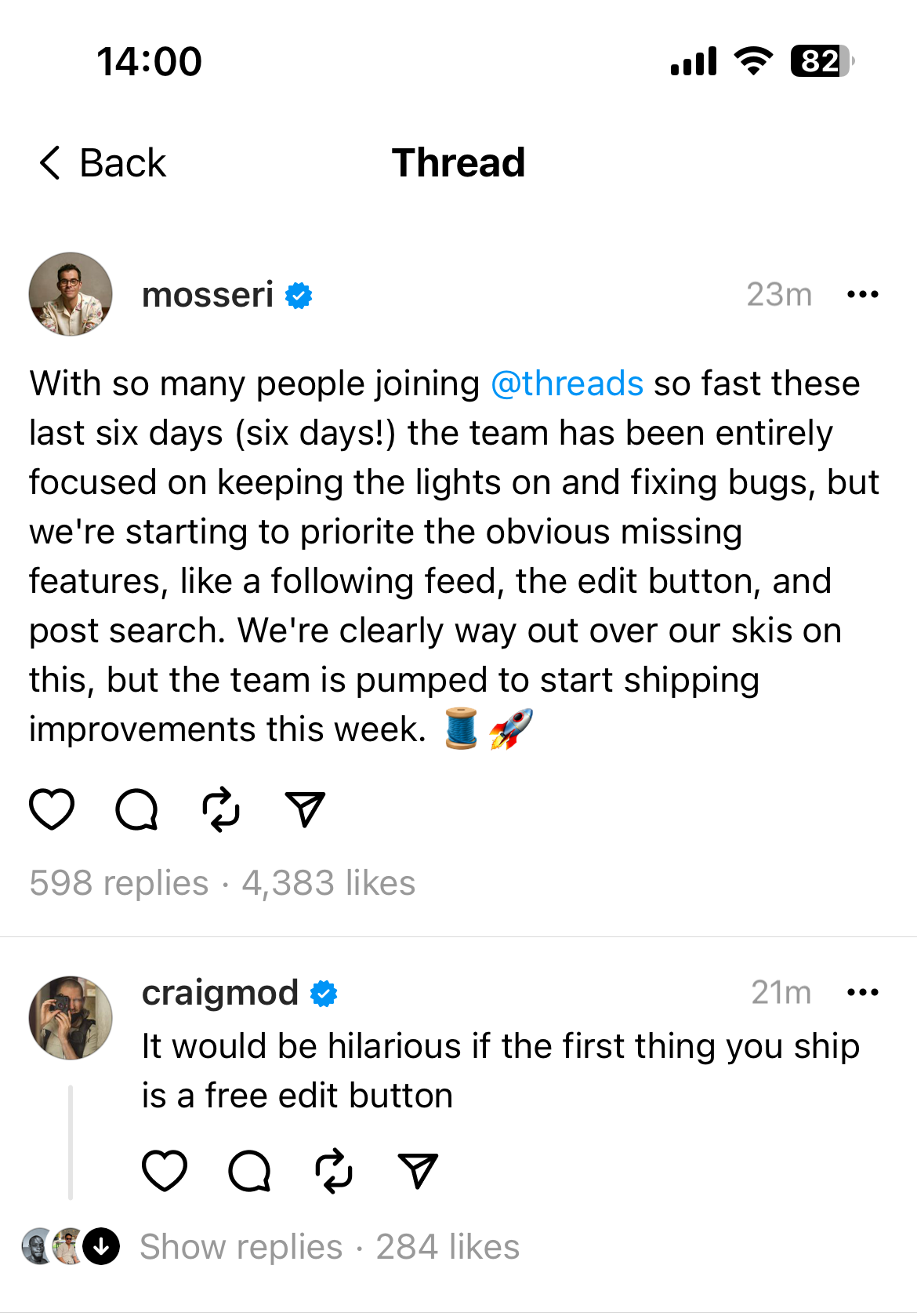 “But we’re starting to [prioritise] the obvious missing features, like a following feed, the edit button, and post search.
