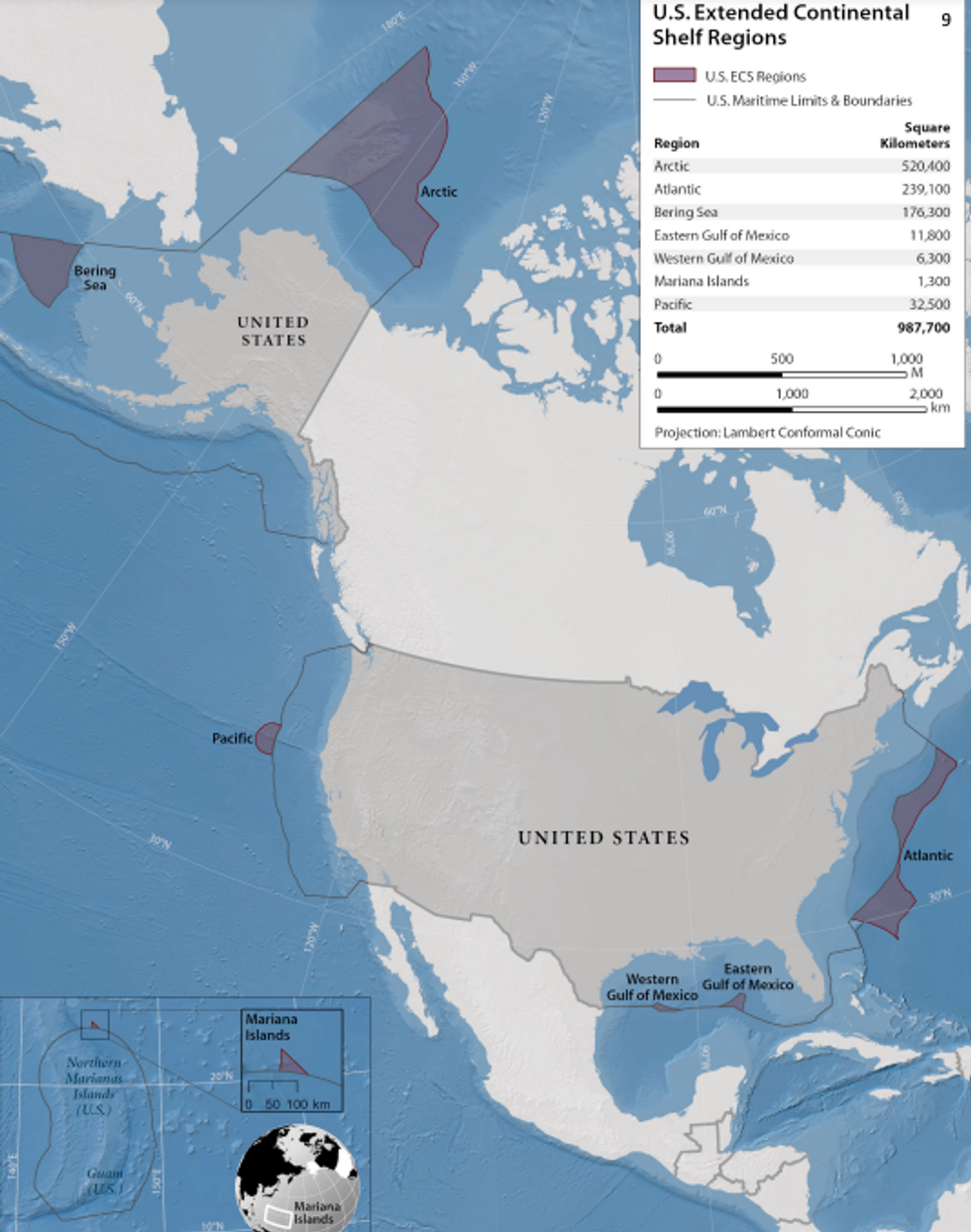 In total these shelves make up seven areas in the Arctic, Atlantic (east coast), Bering Sea, Pacific (west coast), Mariana Islands, and two areas in the Gulf of Mexico.