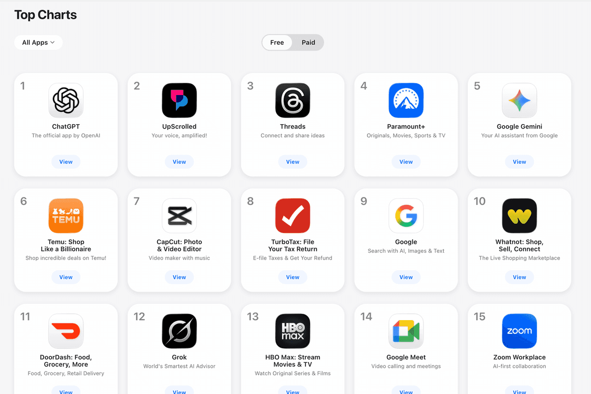 Currently, UpScrolled sits at No.2 on Apple's App Store Top Charts in the US for free apps, compared to TikTok, which is No. 24 on the same charts, indicating clear movement to the new platform.