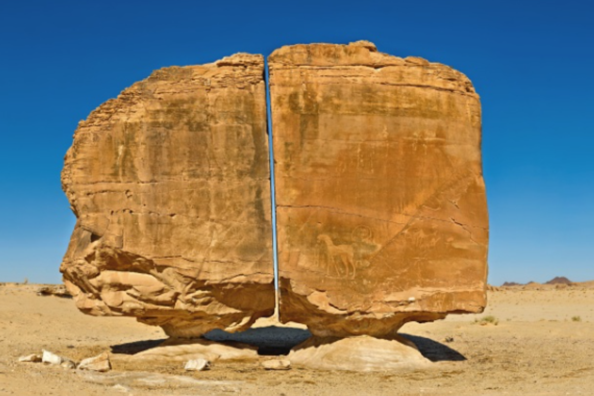 One example of this is the Al Naslaa Rock formation, located in the Tamya Oasis, Saudia Arabia, which has been cleaved clean down the middle in an almost perfectly straight line.
