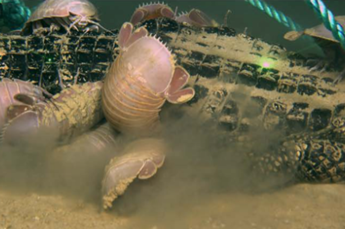 Within a day, nine large isopods (Bathynomus giganteus) were observed feasting on the first carcass, eventually penetrating its hide and eating their meal from the inside out – imagine a crew of foot-long, pink woodlice crawling all over a gator and you get the picture.