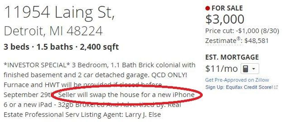 A man has offered to exchange a three-bedroom house (above) in Detroit for a new iPhone 6.