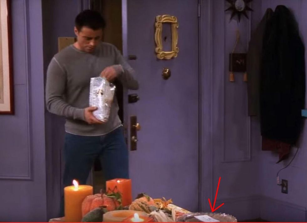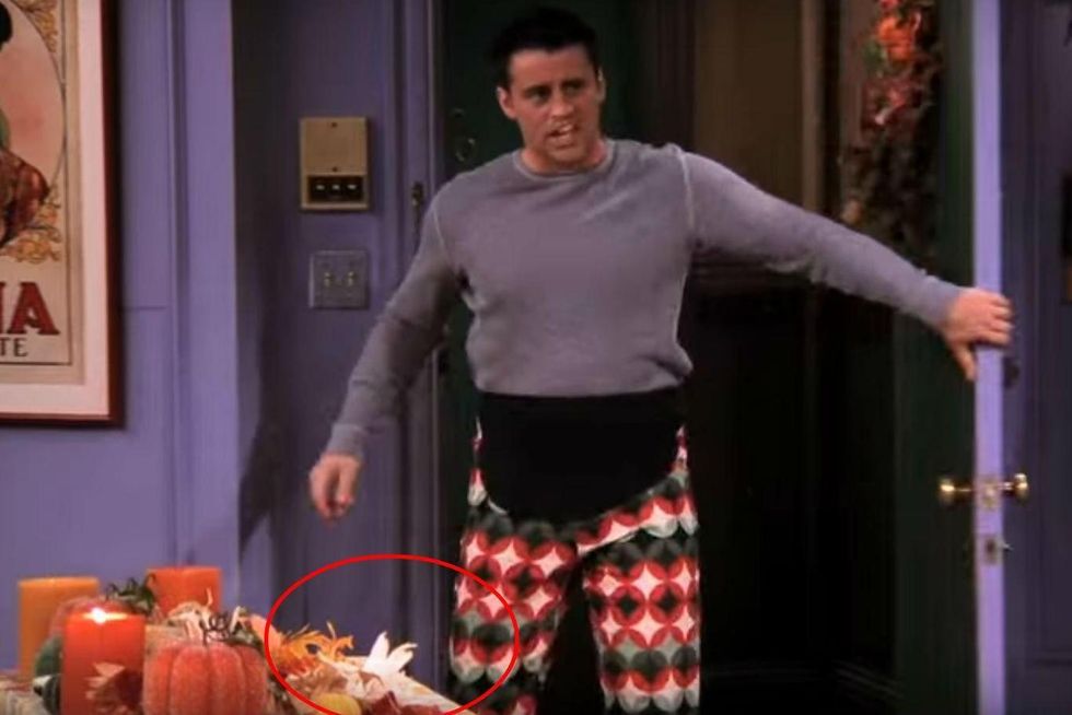 At the end of the episode, Joey returns with his 'Thanksgiving pants' [read: Phoebe’s maternity pants] after attempting to eat an entire turkey, and he walks by the dessert table filled with pies.