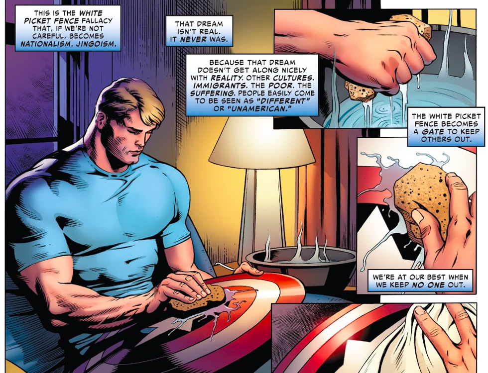A new Marvel comics series has just launched called The United States of Captain America. In the opening pages of the comic Captain America, aka Steve Rogers, reflects on the so-called ‘American dream’ and where he fits into that. Rogers concludes that while the ‘white picket fence’ ideal of working hard, raising a family and making a place for yourself in this world is achievable, it simply isn’t available to everyone and essentially dreams like this aren’t real when things like slavery and institutional racism have existed and continue to exist. Although he argues that this is unfair, he also feels that it is important to strive towards these values for a better world and to exclude no one.