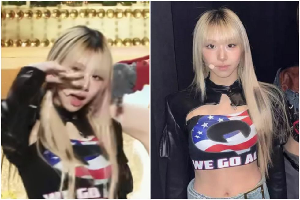 Nothing too remarkable in that, you might think – the other TWICE girls were wearing similar. However, Chaeyoung’s top featured a Q-shaped cut-out of the American flag and an excerpt of the slogan: “Where We Go One, We Go All”.