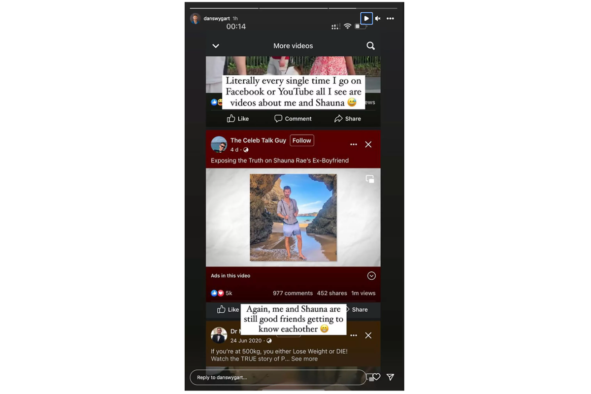 "Literally every single time I go on Facebook or YouTube all I see are videos of me and Shauna," he wrote alongside a screengrab of the headline.