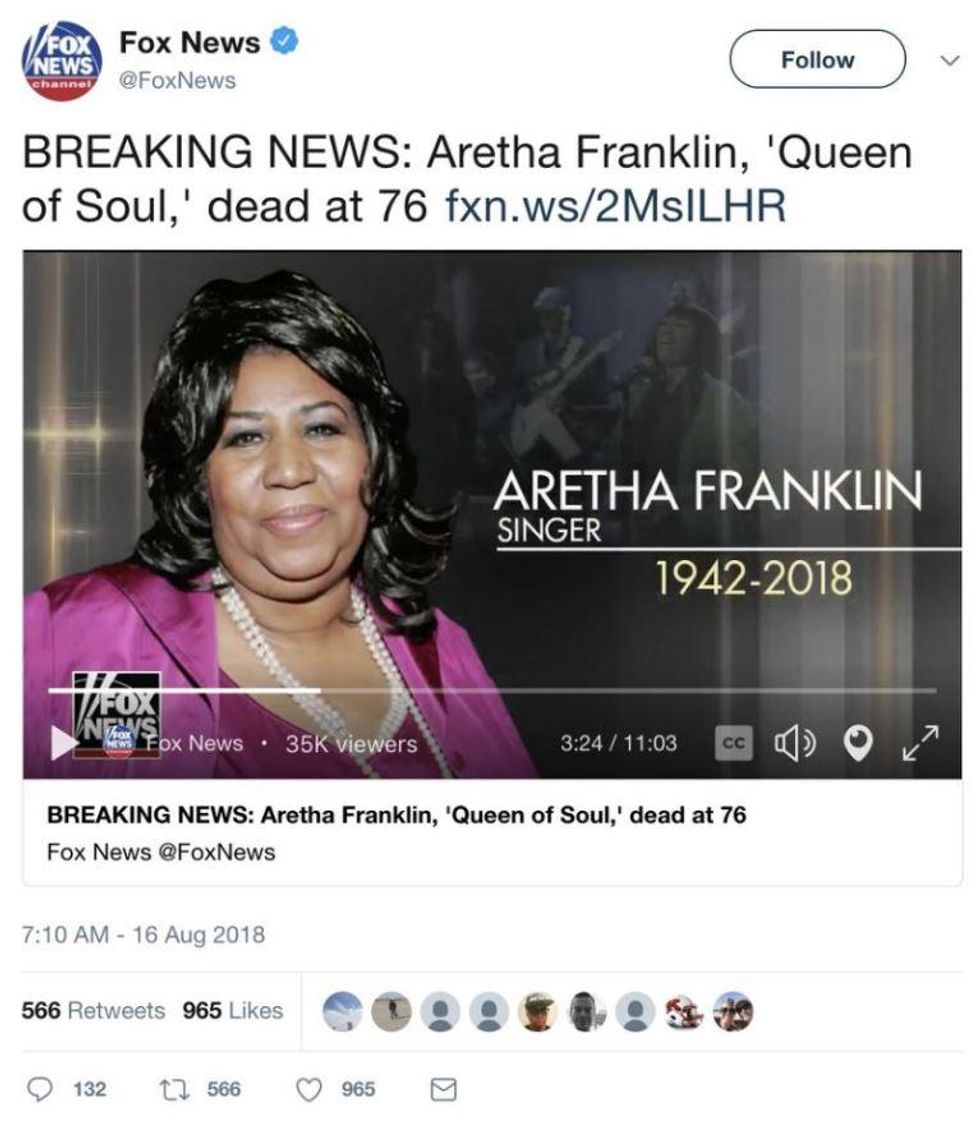 As part of their breaking news coverage of Franklin's passing, Fox posted an 11-minute tribute video on their Twitter account.