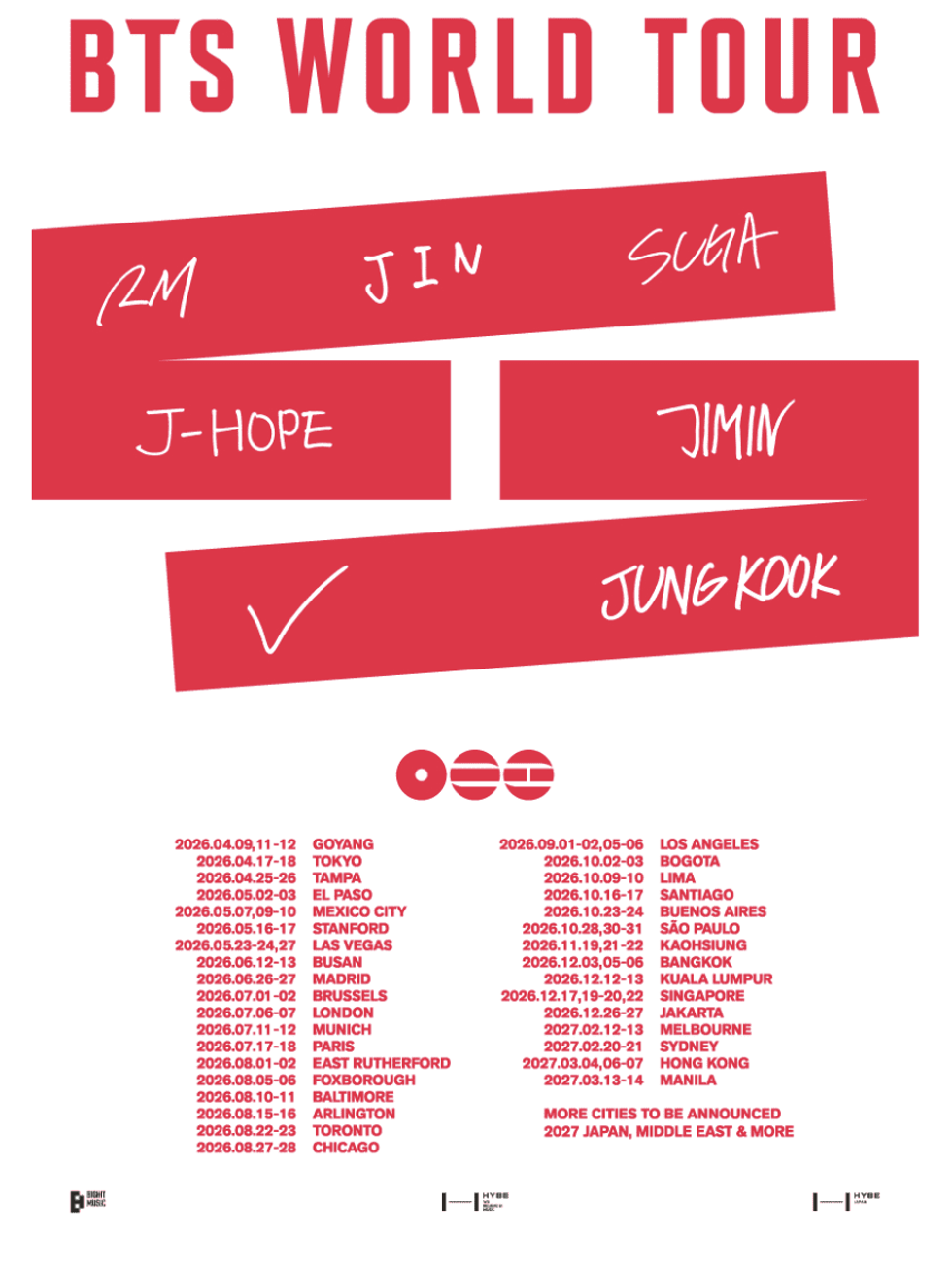The K-pop phenomenon has confirmed a world tour that will stretch across continents and stadiums, running from 2026 into 2027.
