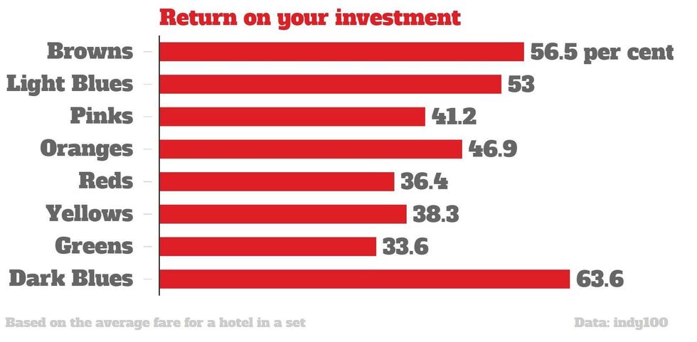 This means, if you can afford them early game, your best chance of winning is to build heavy and hard on the light blues, the pinks and the oranges. Create a road of death on one side of the board and watch the cash come in.