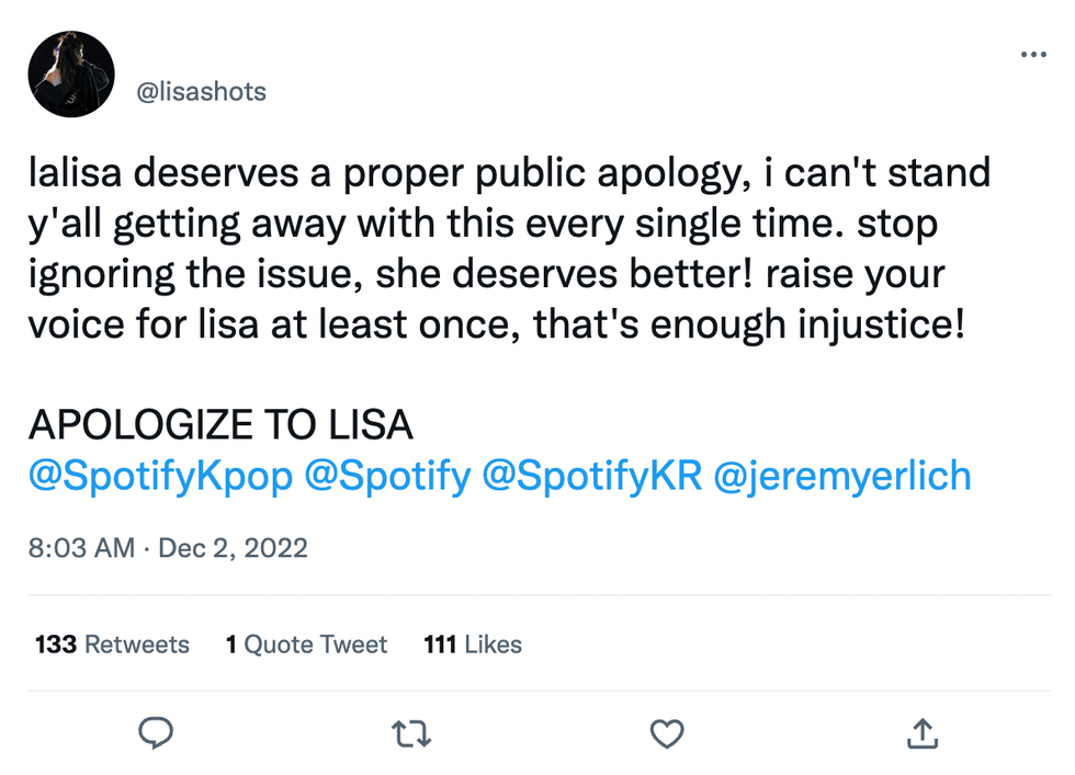 But Lisa fans were not content with the apology and demanded Spotify apologize for making a mistake that led to a hate campaign against Lisa.