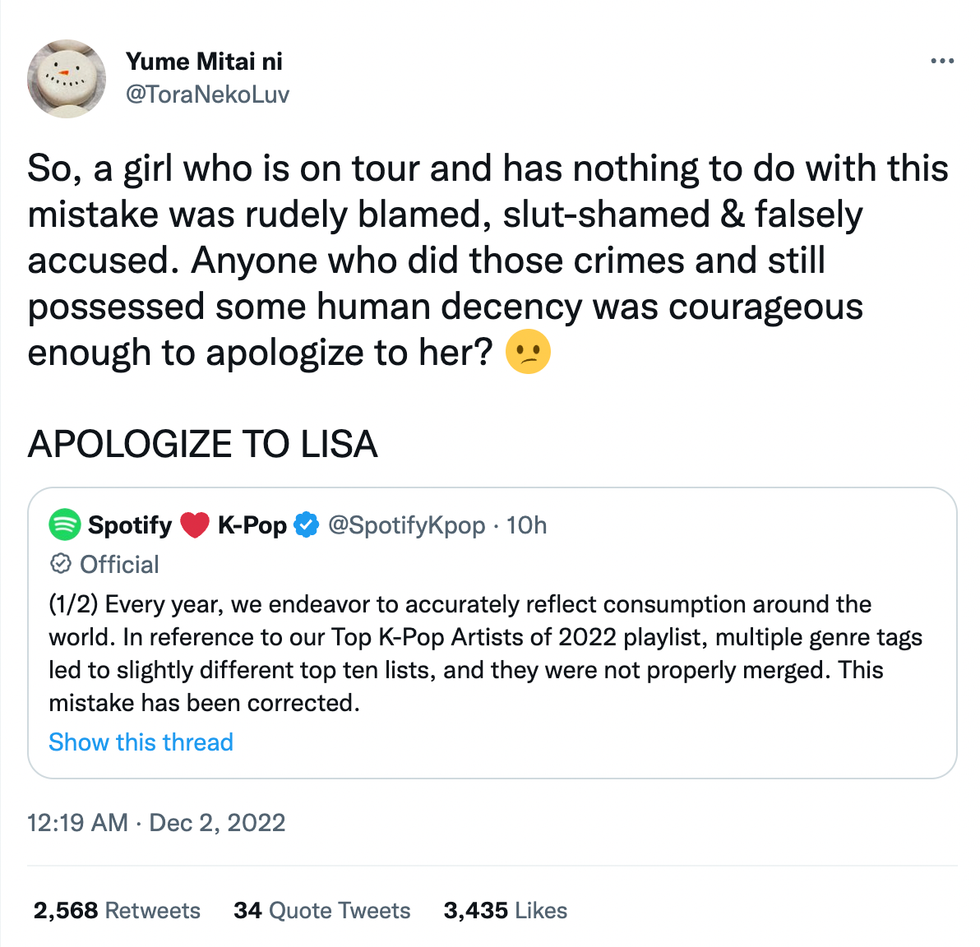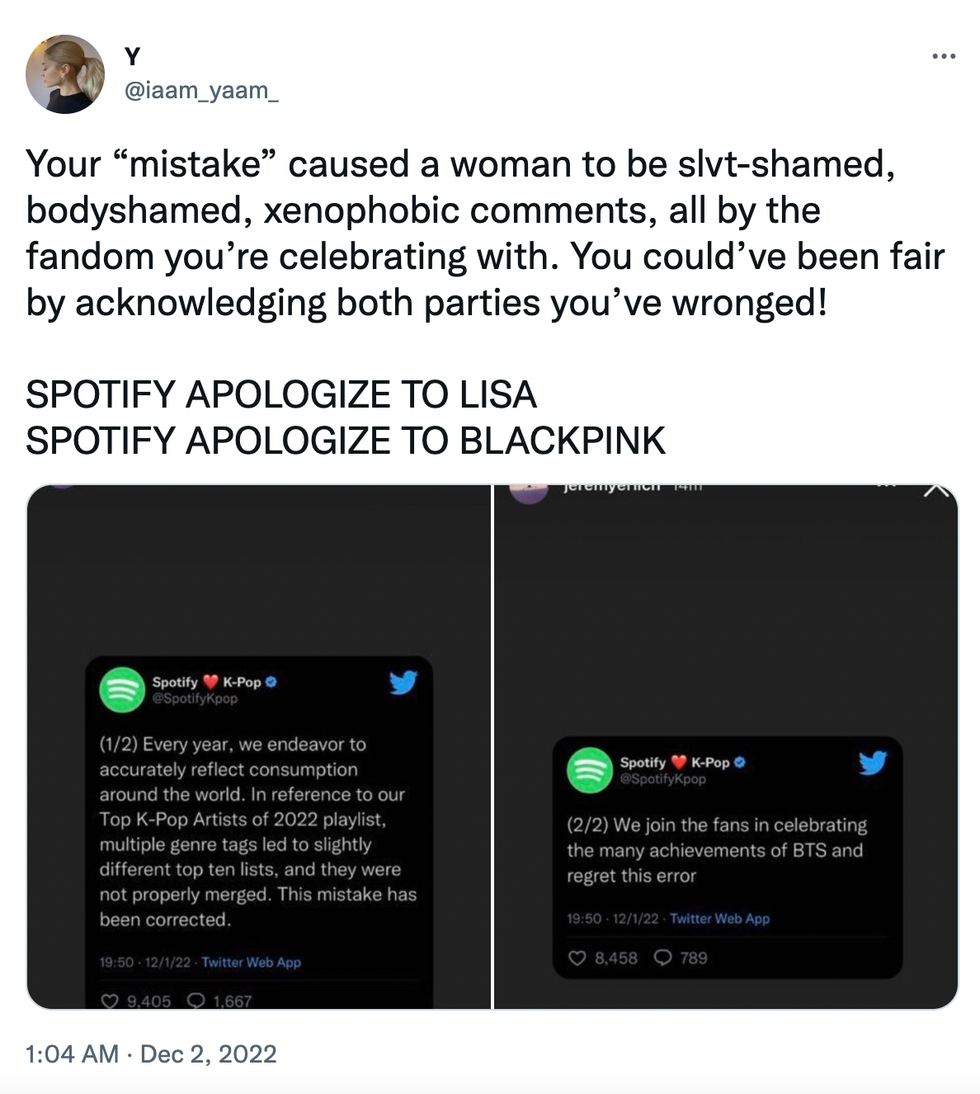 \u201cSaying Lisa "deserved" the misogynistic, xenophobic and slutshaming attacks is utterly disgusting. Why are they acting like it's her fault? That's pure stupidity and you're one to blame @Spotify since it's YOUR mistake\n\nAPOLOGIZE TO LISA\n@jeremyerlich @eldsjal @SpotifyKpop\u201d— Z \u2070\u00b9\u00b9\u00b2 | \u2070\u00b3\u00b2\u2077 (@Z \u2070\u00b9\u00b9\u00b2 | \u2070\u00b3\u00b2\u2077) 1669988919