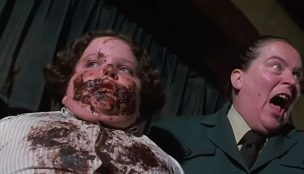 We're all familiar with the scene from the 1996 film, where Bogtrotter is forced by Ms Trunchbull to eat a massive chocolate cake in front of his entire school, which marked Karz's major acting debut.