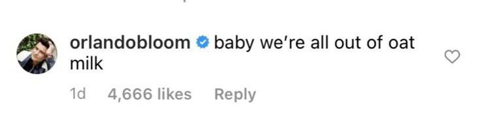 As others gushed over Perry’s pictures, Bloom wrote: ‘baby we’re out of oatmilk’.