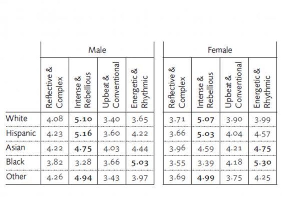 • To find out how much you like music that is Energetic and Rhythmic, take the average of your scores for Electronic, Hip-Hop/Rap and Soul (i.e., add up, then divide by 3).