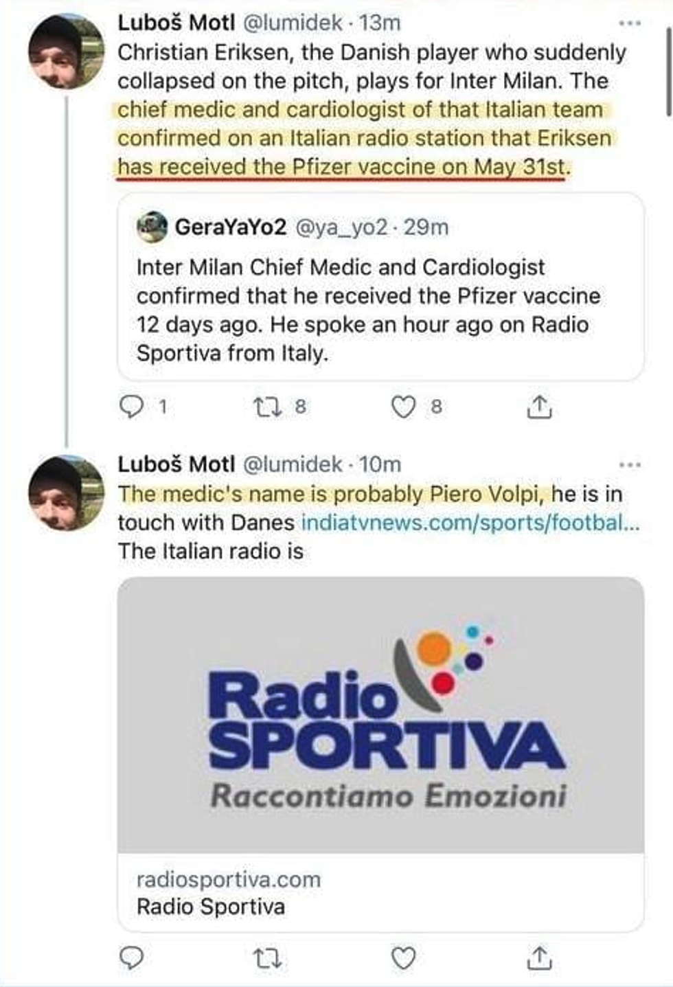 As Vice reports, the rumour began after a Czech theoretical theorist named Lubos Motl tweeted that the chief medic and cardiologist at Inter Milan had told Radio Sportiva that Eriksen had been given the Pfizer vaccine on 31st May.