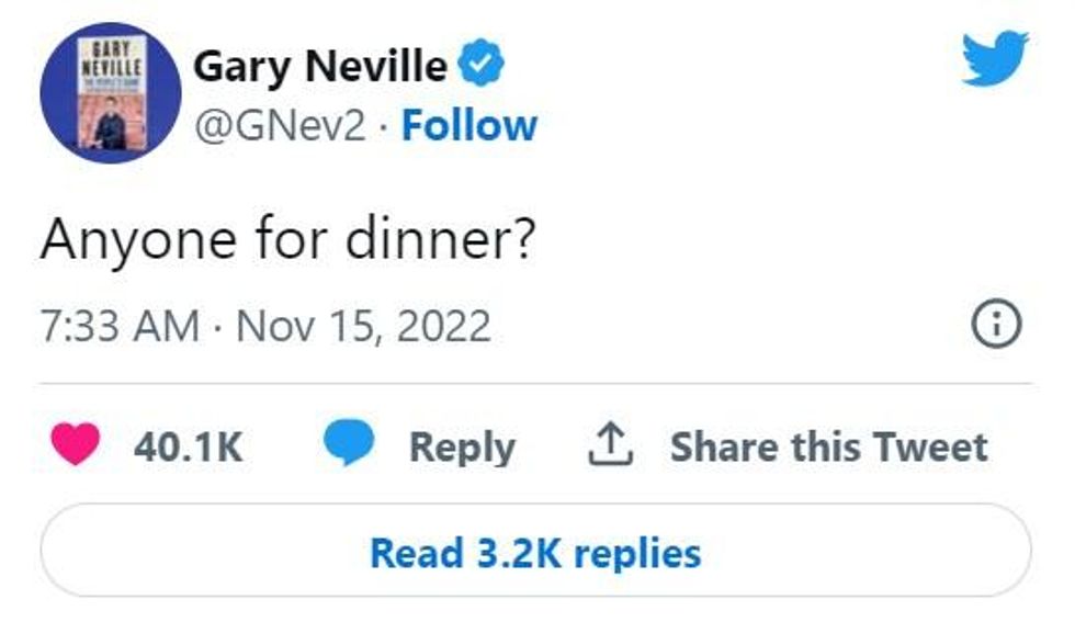 In a tweet this morning, (November 15), Neville decided to have a laugh by jokingly referencing the comment in a tweet, he wrote: "Anyone for dinner?"