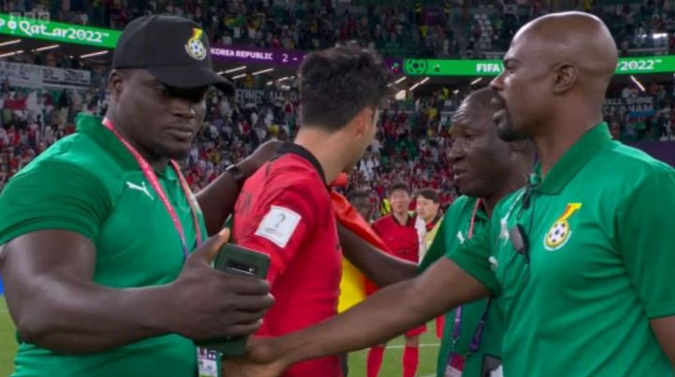 Son Heung-min was in tears after South Korea's defeat to Ghana - but one of Ghana's coaching staff decided it was the perfect opportunity to get a selfie with the inconsolable footballer.