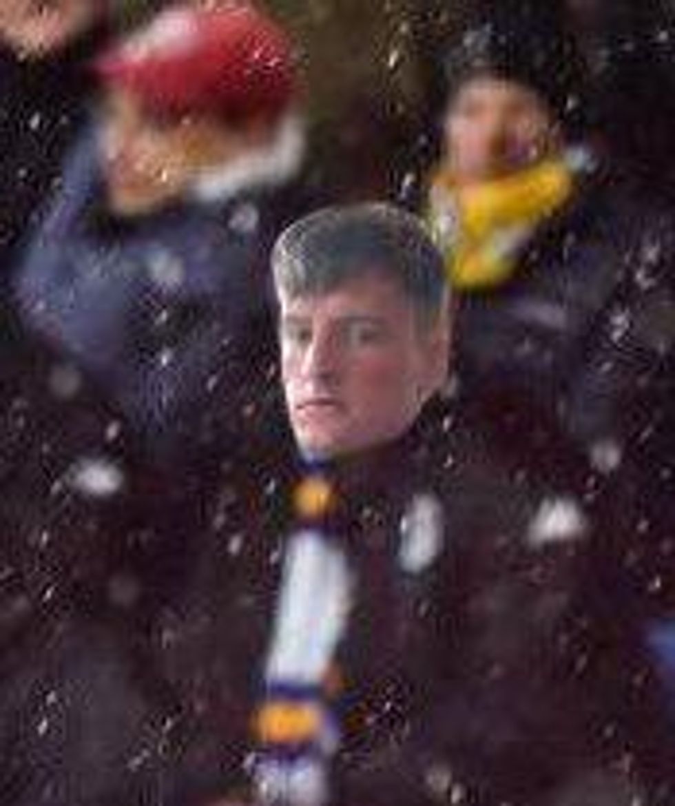 There’s a face in the crowd by Maguire’s right shoulder which looks strangely out of place with the rest of the Leeds fans.