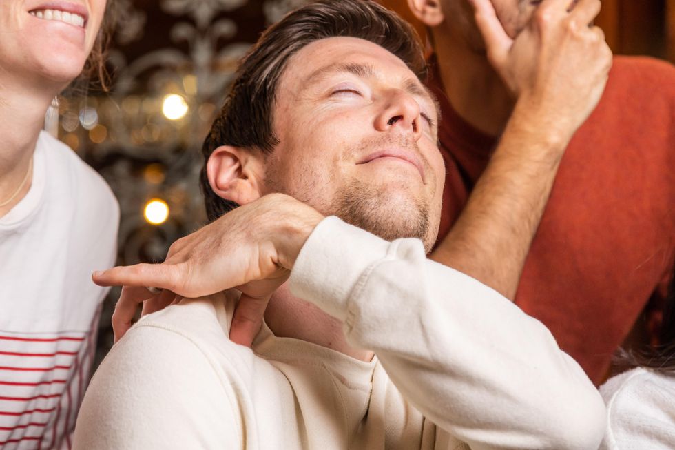 "Get stuck in" squeezes: Make a C with your hands and place them over their shoulders, so you thumb is on their back and your fingers are near to their collarbone. Start close to the neck and gently squeeze once, then move slightly down the shoulder. Repeat this until you reach the end of their shoulders.