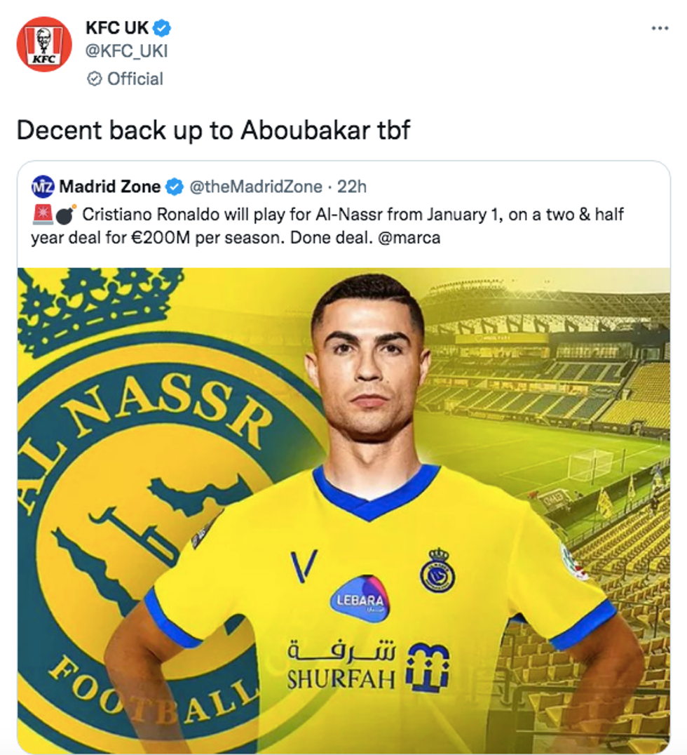 The fast food chain has surprised social media users by going in hard on Cristiano Ronaldo’s rumoured transfer to Saudi Arabia on Twitter.