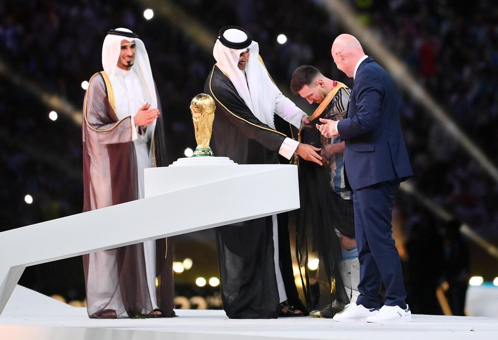 During the presentation ceremony, FIFA president Gianni Infantino and the Emir of Qatar Sheikh Tamim bin Hamad Al Thani placed a black and gold robe on Messi.