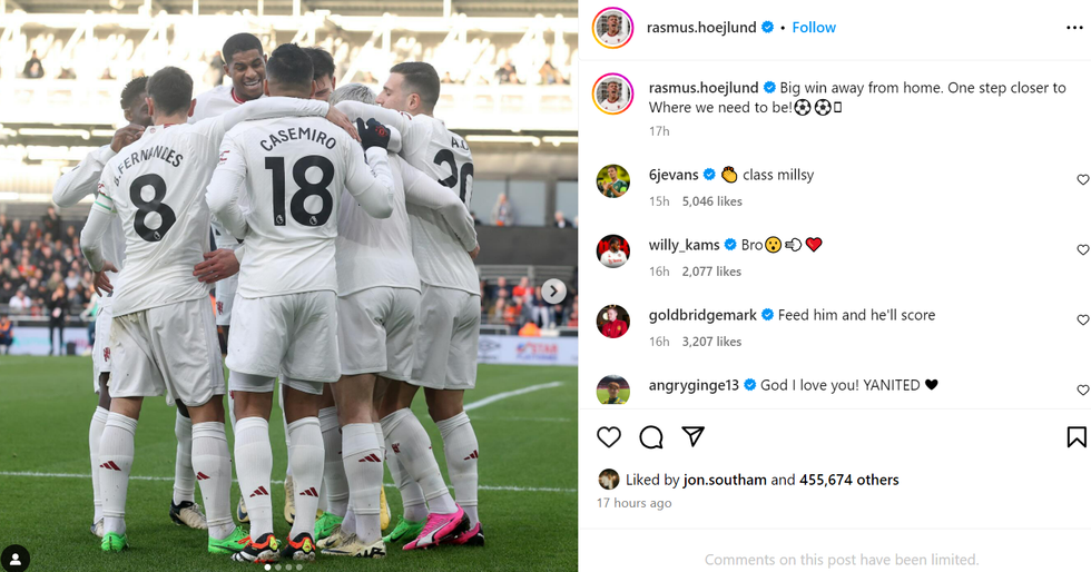 Plenty of people shared their support for Hojlund, but the comment that most caught the eye was Johnny Evans who wrote: "Class Millsy."