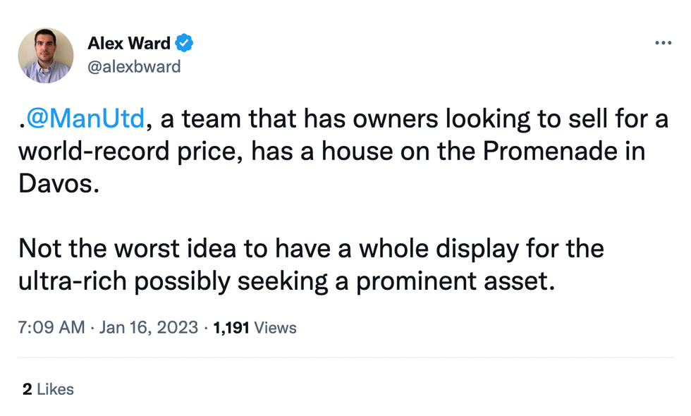 \u201cDavos with the first ever Manchester United Fanshop in Switzerland\u2026 #Davos #WEF23 #WEF2023 @ManUtd\u201d— Samuel Rosenast \ud83c\udde8\ud83c\udded (@Samuel Rosenast \ud83c\udde8\ud83c\udded) 1673873051