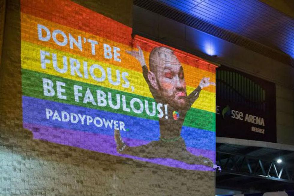 As well as being booed by the audience when his name was read out, Fury was mocked by bookmakers Paddy Power who shone a huge rainbow flag projection onto the side of Belfast's SSE Arena where the event was being held.