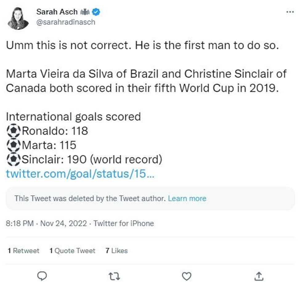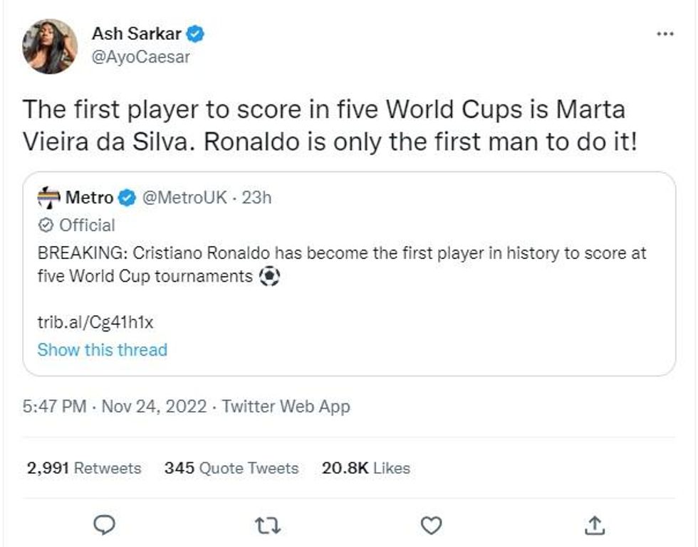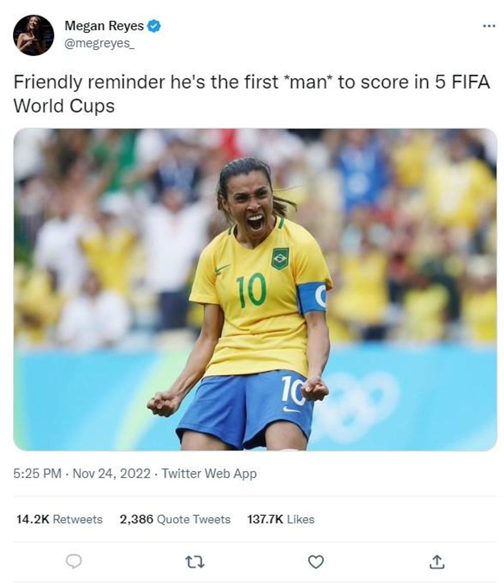 While Ronaldo may be the first male footballer to achieve the milestone, it was actually Brazilian woman's football player Marta Vieira da Silva who was the first to score in five World Cups in 2019.