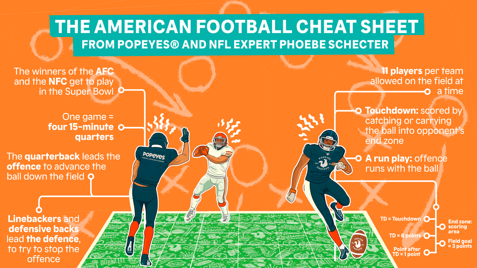 To help those tuning in for the first time, Popeyes® UK - which famously hails from the US and home of American football - has partnered with the UK’s resident expert and former Buffalo Bills coach, Phoebe Schecter, to create a cheat sheet for the game.