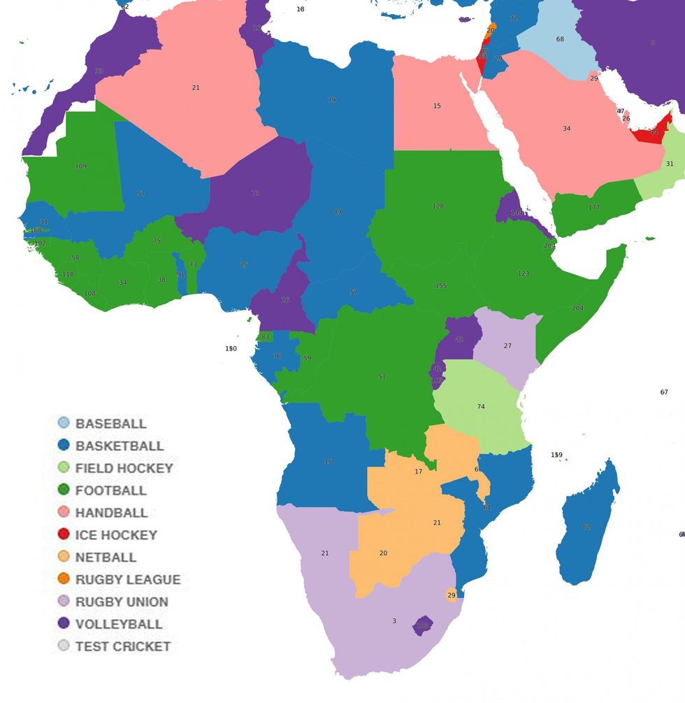 We surveyed the world rankings of the most popular team sports to come up with the map: football, rugby Union, test cricket, volleyball, baseball, basketball, ice hockey, field hockey, handball, netball, and rugby league.