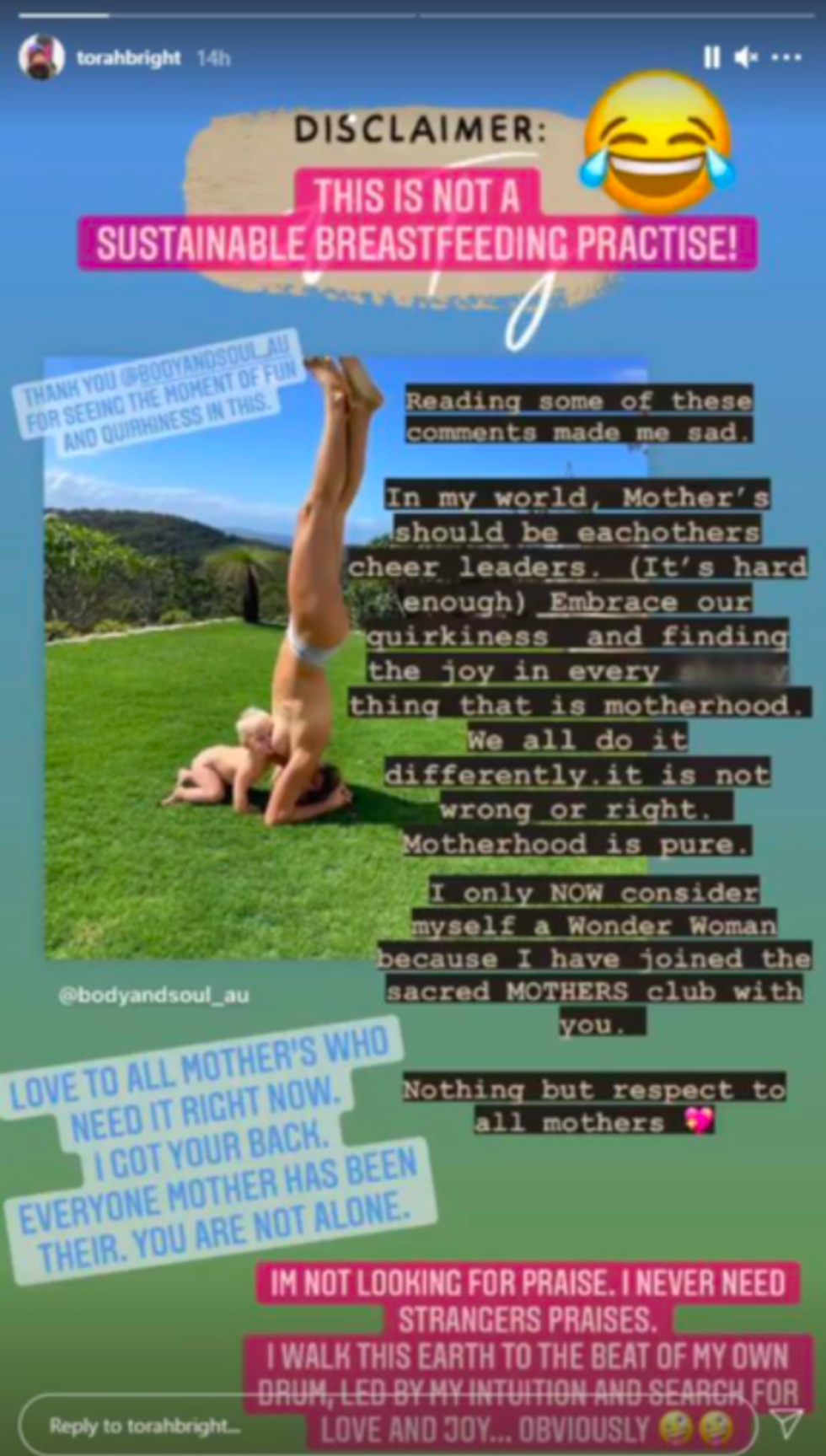 Australian Olympic snowboarding champion Torah Bright has responded to the backlash she received after posting a photo of her breastfeeding her son on Instagram.