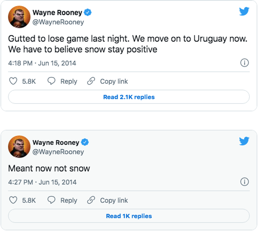 Rather than taking down the post and editing it, Wayne decided to clarify his ‘snow/now’ typo in a follow up tweet.