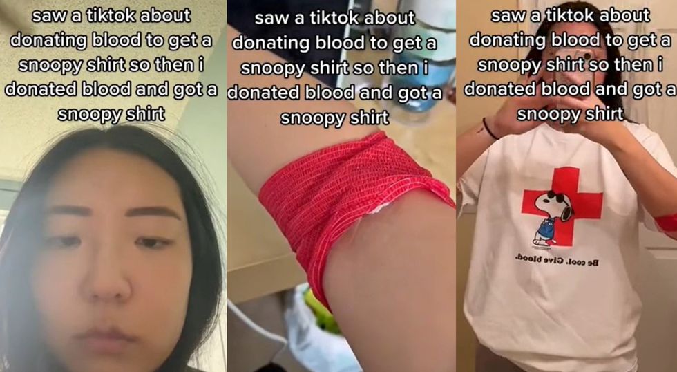 "POV: you donated blood to get the red cross x snoppy t-shirt," @j_diddy3 wrote with a video of getting the freebie which has 1.1m views.