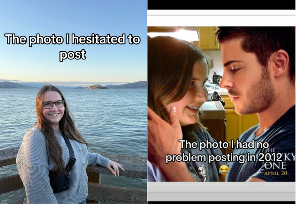 Another example came from TikToker @rachhhh80, who "hesitated to post" a photo of herself recently posing near a body of water and then shared how she "had no problem posting in 2012" and edit of her younger self being embraced by Zac Efron in his 2012 film post for The Lucky One.