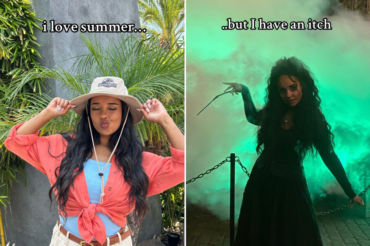 Creator @zaires.spooks looked pretty content in a photo she took in the summer, but then followed this up with her "itch" as she showed viewers her Bellatrix Lestrange costume - the evil witch from the Harry Potter franchise.