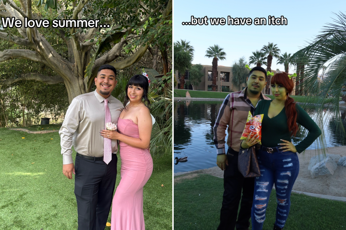 TikToker @jazmyneteaa and her boyfriend looked loved up in their summer photo, but in their Halloween "itch" snap they looked even more iconic as Shrek and Fiona, with green skin and ogre ears.
