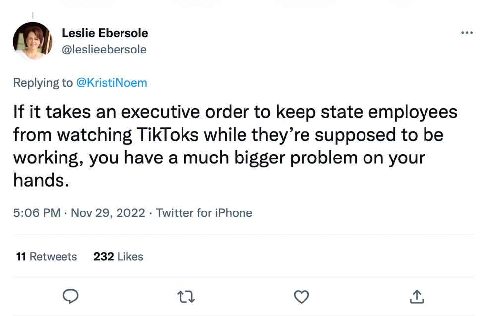 \u201cToday, I signed an Executive Order that bans the Chinese social media platform TikTok for state government agencies, employees, and contractors using state devices.\n\nSouth Dakota will have no part in the intelligence gathering operations of the Chinese Communist Party.\u201d— Kristi Noem (@Kristi Noem) 1669751232