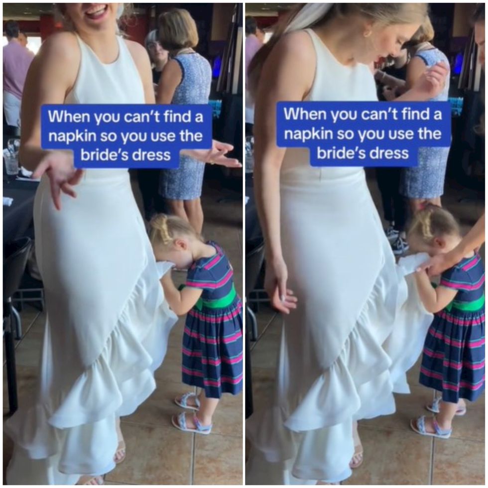 In the clip posted by The Fox Twins (@thefoxsaystwins), the brief 5-second clip shows the little girl going up to the bride and using the bottom of the white dress as a napkin to wipe her face.