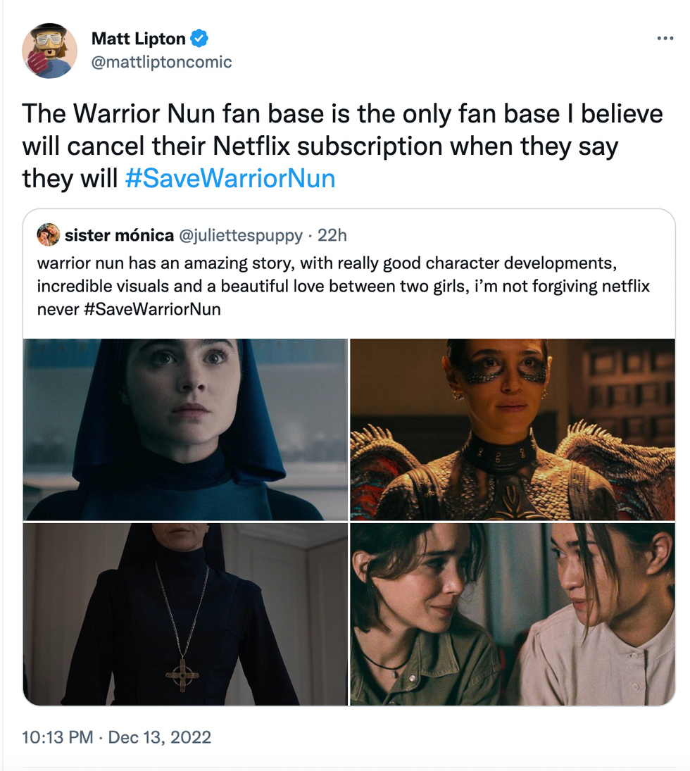 \u201cNETFLIX REALLY HAD THE AUDACITY TO RENEW YR AND NOT WN I'M GONNA COMMIT ARSON Y'ALL ISTFG #SaveWarriorNun #cancelnetflix\u201d— sister fedex | \ud83c\udde6\ud83c\uddf7 SAVE WARRIOR NUN (@sister fedex | \ud83c\udde6\ud83c\uddf7 SAVE WARRIOR NUN) 1671027445