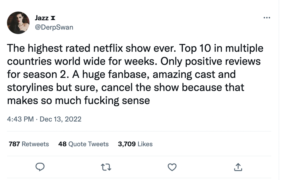 But the stats didn't seem to matter as Netflix announced they had cancelled the show.