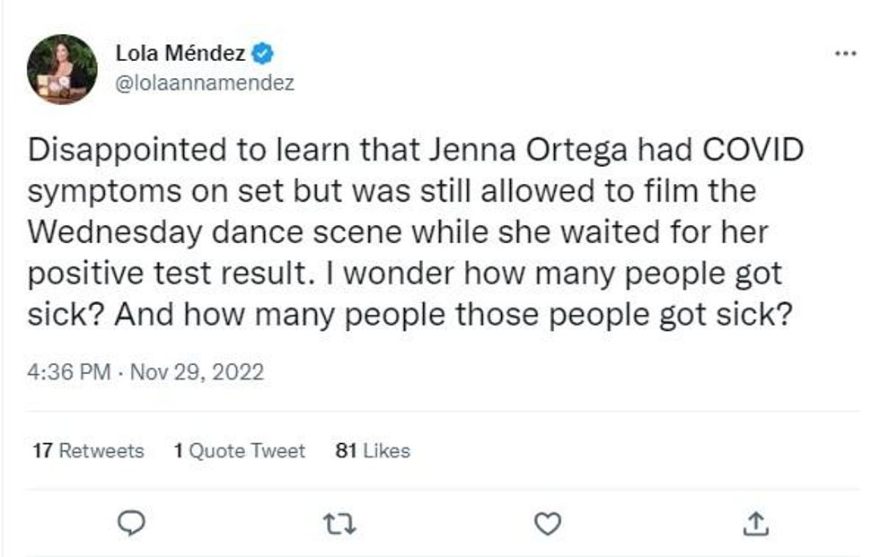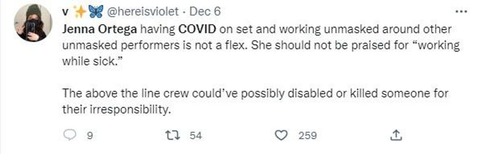 However, Ortega has faced criticism for shooting the scene while she was ill with Covid and people have also slammed those in charge for not sending the actor home.