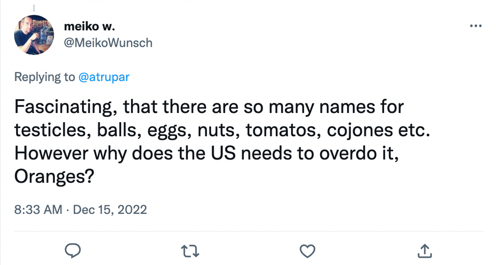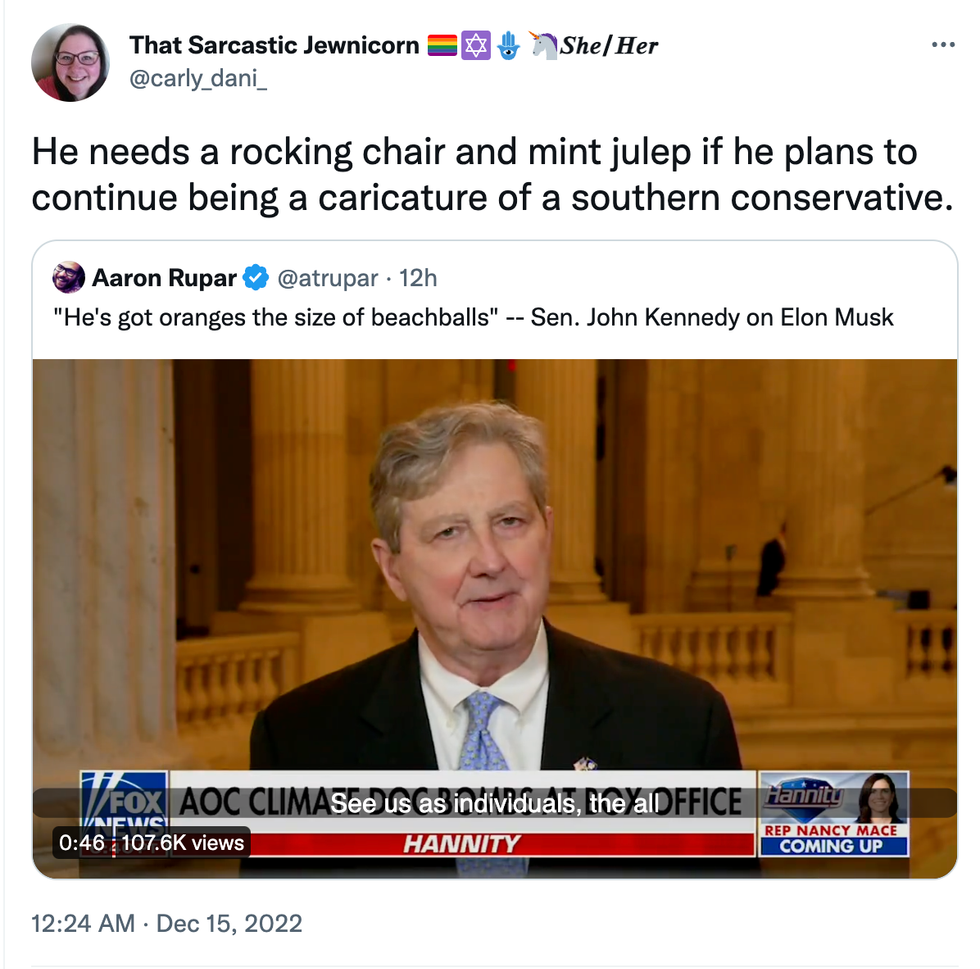 \u201c"He's got oranges the size of beachballs" -- Sen. John Kennedy on Elon Musk\u201d— Aaron Rupar (@Aaron Rupar) 1671072363