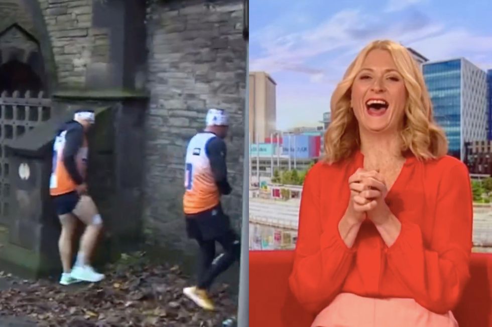 However, as soon as presenter Charlie Stayt cut to the live coverage, Sinfield immediately stopped to urinate against a wall.