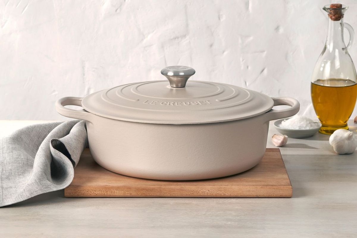 'Brioche' is one of Le Creuset's newest sell-out colours, and Meghan's braising pan is seen in the show being used to make focaccia. Their range of pans are super popular due to their durability (they're made from cast iron which can last a lifetime), and fun range of shades.
