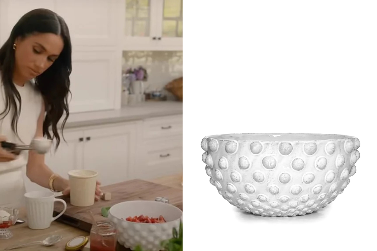 While Meghan is whipping up a dessert for her friend, Abigail Spencer, she can be seen using this pricey salad bowl to hold her chopped strawberries. The same bowl has been spotted in her own kitchen in other videos.
