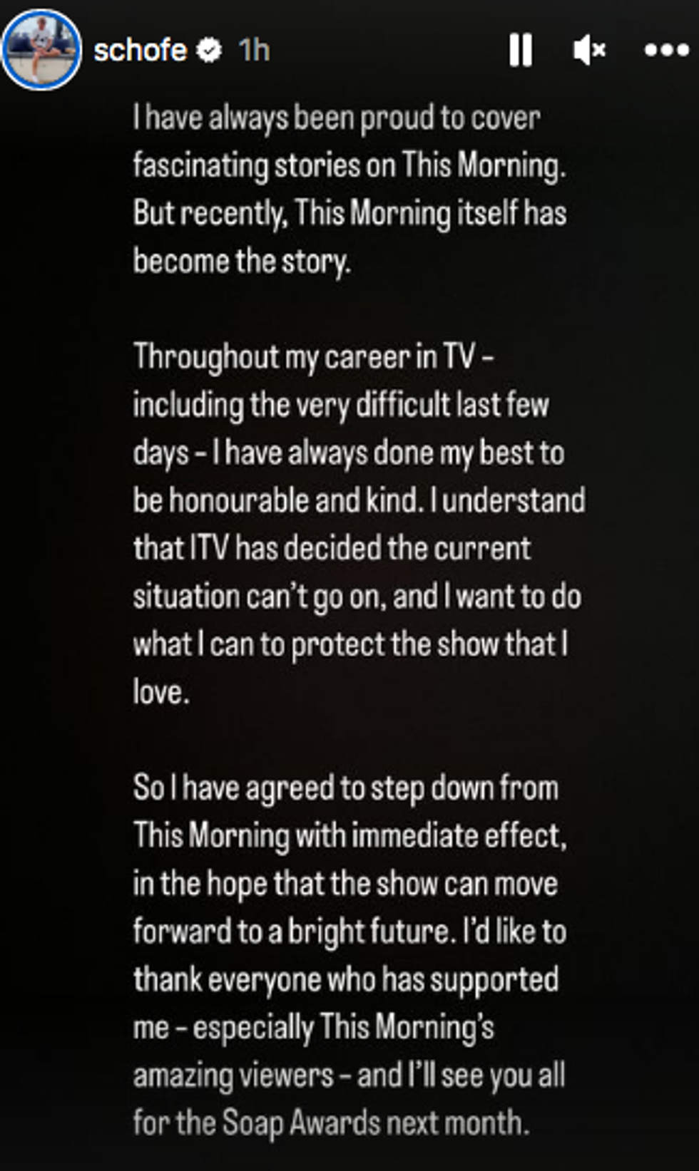 “So I have agreed to step down from This Morning with immediate effect, in the hope that the show can move forward to a bright future. I’d like to thank everyone who has supported me – especially This Morning’s amazing viewers – and I’ll see you all for the Soap Awards next month.”