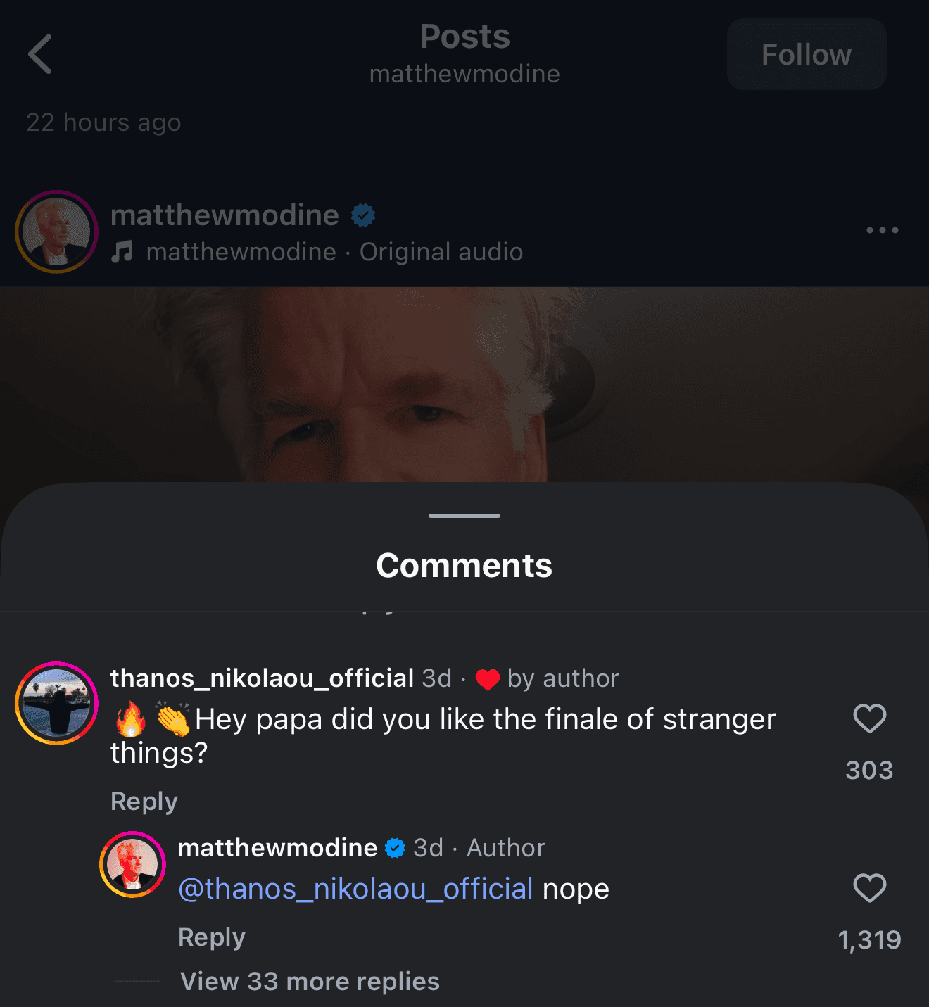 In an Instagram post from two days ago, one fan commented underneath asking Modine whether he "liked" the finale of Stranger Things.