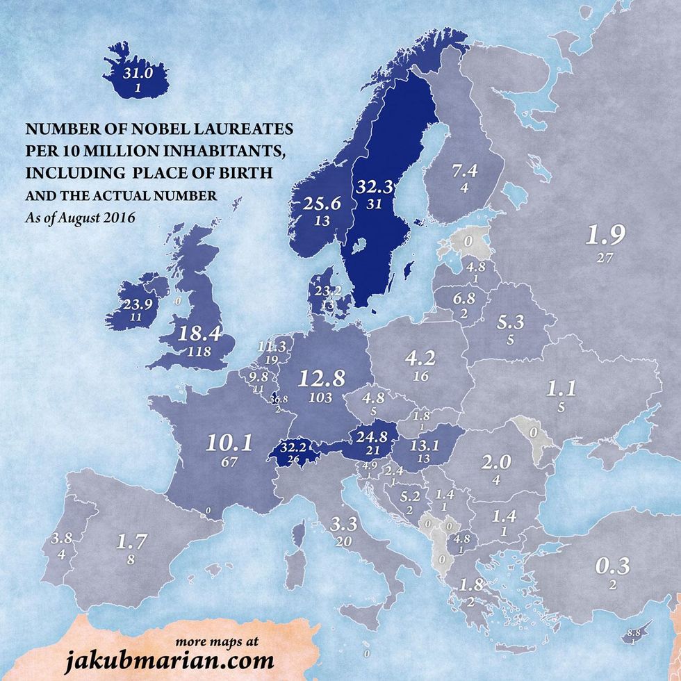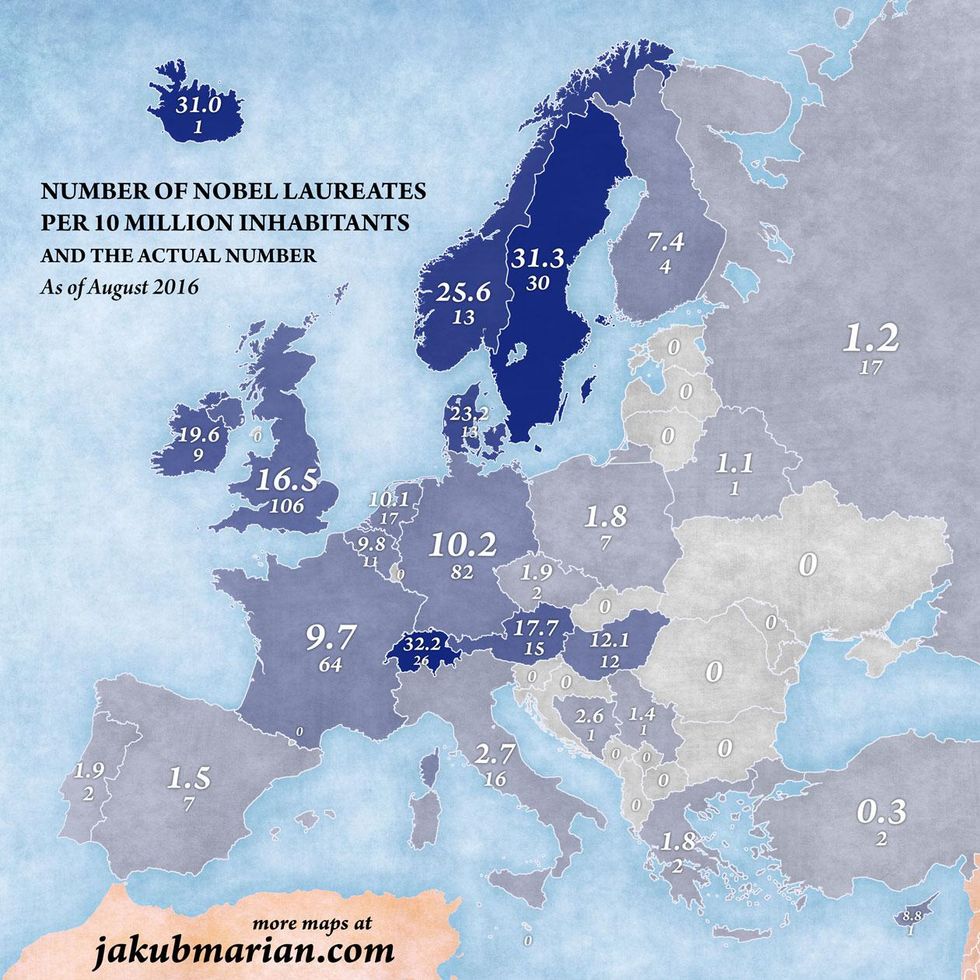The cartographer and educational blogger Jakub Marian has produced two maps that show the number of Nobel laureates per capita in Europe.